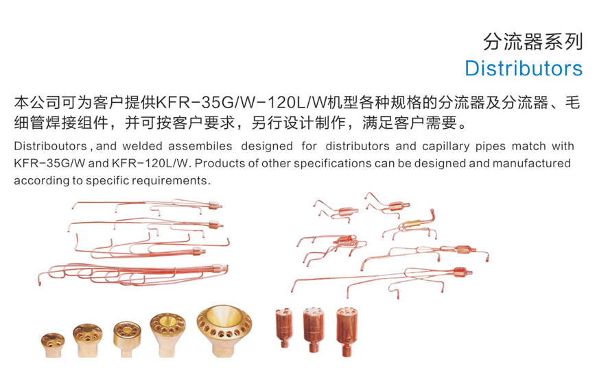 本公司可為客戶提供KFR-35G/W-120L/W機型各種規(guī)格的分流器及分流器、毛細(xì)管焊接組件,并可按客戶要求,另行設(shè)計制作,滿足客戶需要。